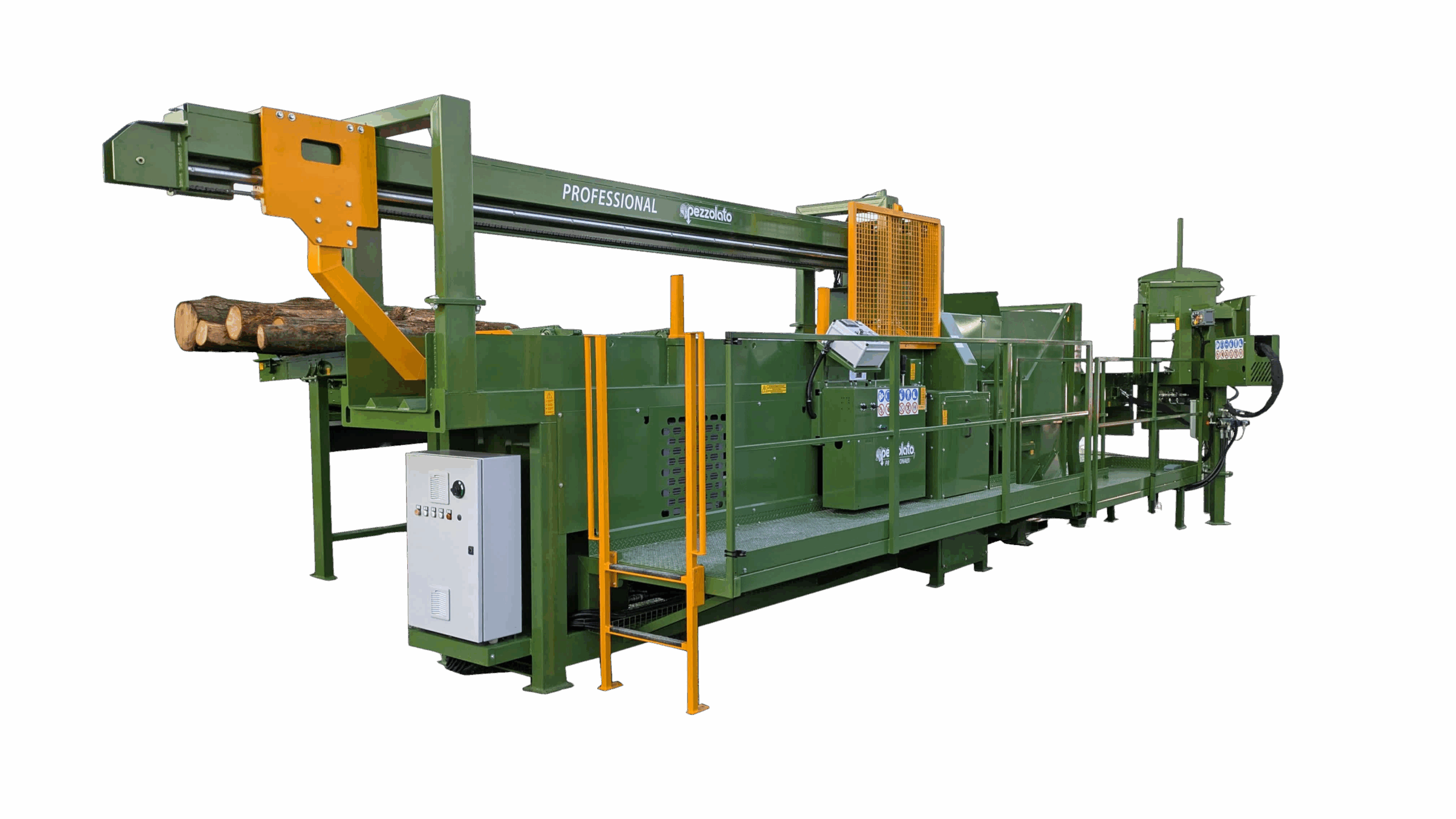 L'offre toujours croissante de grumes de grand diamètre, qui ne sont pas adaptées à la production de matériaux pour l'industrie (scieries) a conduit Pezzolato à créer un système qui permet d'obtenir du bois de chauffage de haute qualité, en transformant des grumes jusqu'à 600 mm de diamètre. L'unité de fendage vertical automatique permet de traiter des grumes de tout type pour la production de bois de chauffage et d'allume-feu.