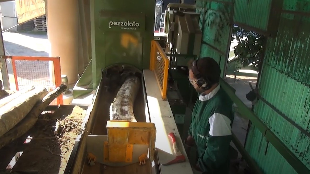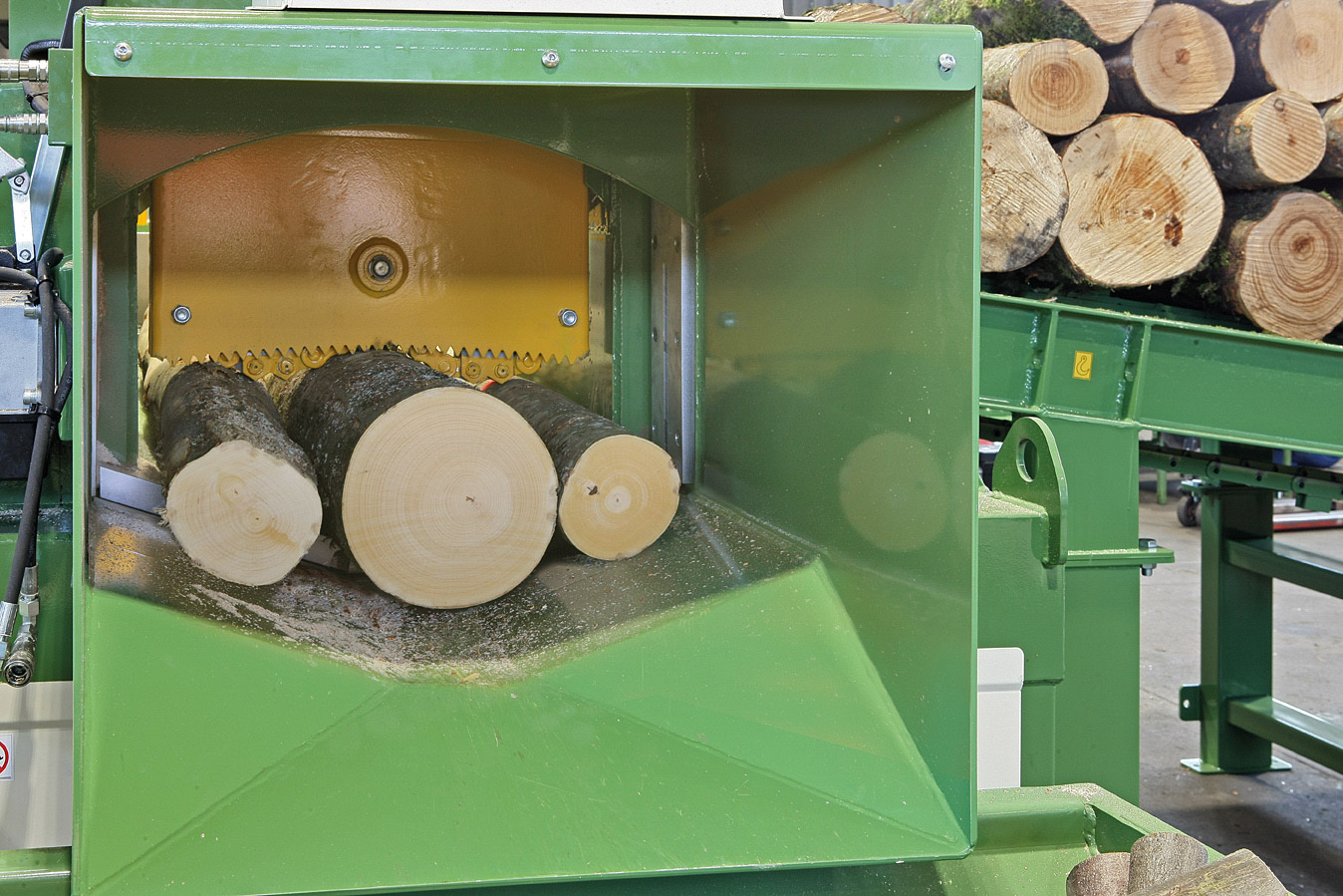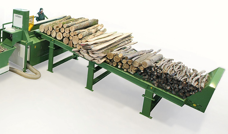 Après la coupe, les grumes tombent sur le tapis métallique « S », qui les recueille et agit comme un tampon, transportant le matériau devant le fendeur où l’opérateur effectue le fendage des plus gros morceaux.